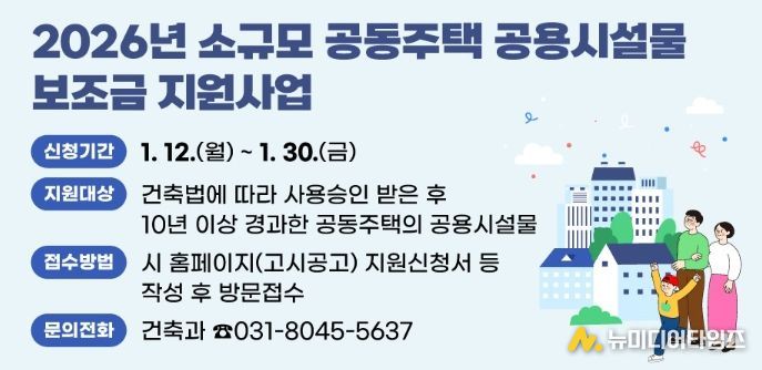 안양시가 안전하고 쾌적한 주거환경 조성을 위해 ‘2026년 소규모 공동주택 공용시설물 보조금 지원사업’을 추진한다고 12일 밝혔다.