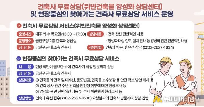 매주 화·수·목요일 오후 1시 30분부터 오후 5시 30분까지 금천구청 종합청사 2층 건축과 상담실을 방문하면 서비스를 받을 수 있다. 이는 기존 주 2일 운영하던 것을 주 3일로 확대한 것이다.