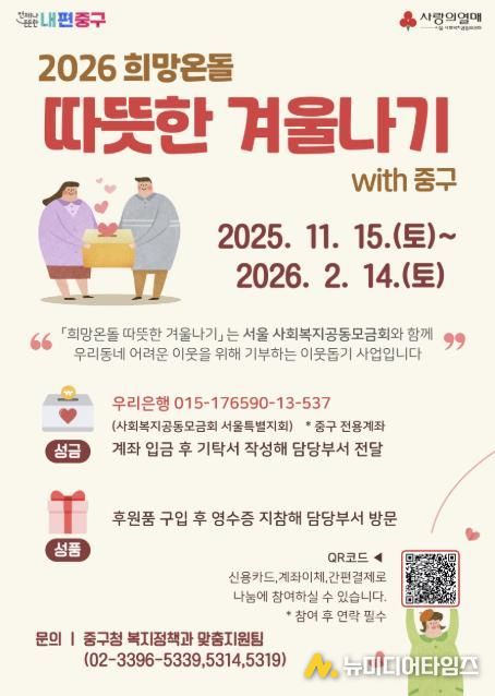 서울 중구가 지난해 11월 15일부터 사회복지공동모금회와 함께 진행 중인‘2026 희망온돌 따뜻한 겨울나기’사업에 지난 1월 13일 기준, 구의 목표 모금액의 약 69%인 12억1천여만원의 성금·품이 모였다고 밝혔다. 구는 설 명절을 앞두고 있는 만큼 목표액을 달성할 수 있을 것으로 내다보고 있다.