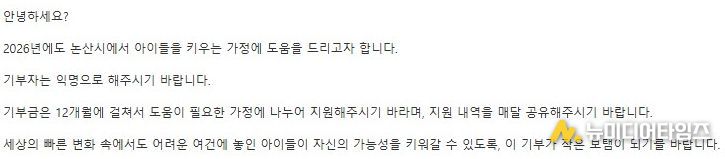 한편, 2020년 시작된 익명 기부자의 선행은 매년 논산시의 겨울을 녹이는 대표적인 미담으로 자리 잡았다. 시는 기부금 전달 과정에서 기부자의 익명성을 철저히 보장하면서도 그 따뜻한 영향력이 지역사회 전반으로 퍼져나갈 수 있도록 노력하고 있다.
