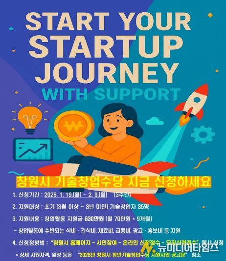 창원특례시는 1월 19일부터 2월 9일까지 ‘2026년 청년기술창업수당 지원사업’ 참여자 35명을 모집한다고 밝혔다.