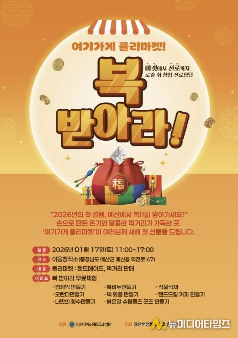 플리마켓은 오전 11시부터 오후 5시까지 ‘2026년의 첫 설렘, 예산에서 복(福) 받아가세요’를 주제로 진행되며, △지역 소상공인 21개소가 참여하는 핸드메이드 제품 및 로컬 푸드 판매 △컵케이크·오란다·떡 와플·향수·복비누·굿즈 만들기 등 9종의 무료 체험 프로그램 △로컬 취·창업 진로 상담 등으로 구성된다.