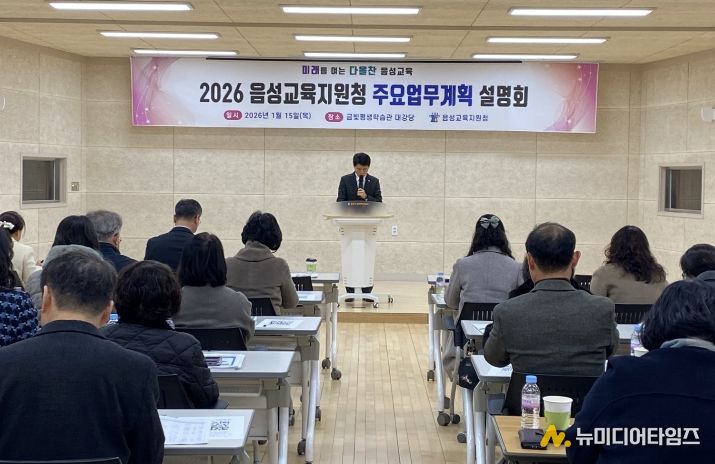 음성교육지원청은 1월 15일 금빛평생학습관 대강당에서 관내 유·초·중·고·특수·각종학교 교(원)장 43명을 대상으로 ‘2026. 주요업무계획 설명회’를 개최했다.