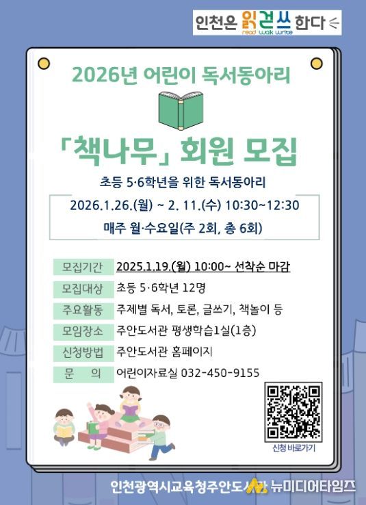 인천광역시교육청주안도서관은 예비 초등 5·6학년 학생을 대상으로 하는 독서동아리 '책나무' 회원을 모집한다.
