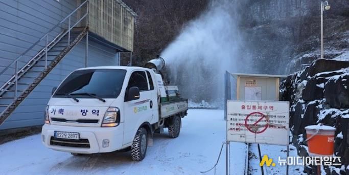 소독은 농장 출입구와 축사 주변, 차량 바퀴 등을 중심으로 진행되며 소 사육농가의 경우 축사 내부 소독도 병행된다.