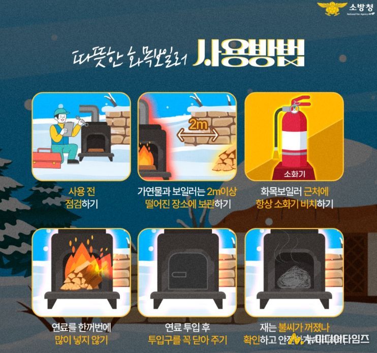 이에 소방서는 화목보일러 사용 시 ▲보일러 주변 가연물 제거 ▲사용 후 잔여 불씨 완전 제거 ▲보일러 인근 소화기 비치 ▲보일러 가동 전 문 닫기 ▲연통 및 재받이 정기적인 청소 ▲장시간 외출 시 보일러 사용 자제 등의 안전수칙을 준수해 줄 것을 당부하고 있다.