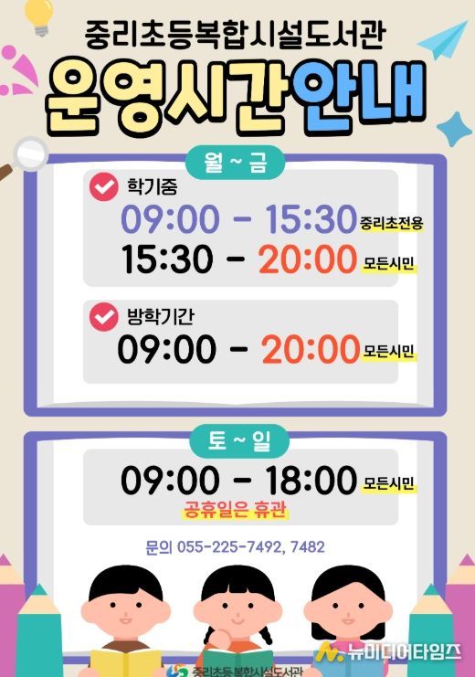 창원특례시 중리초등복합시설도서관은 내서도서관 재건립 장기 휴관으로 인한 불편을 해소하고, 시민들의 도서관 이용 편의를 높이기 위해 2026년 1월 2일부터 평일 저녁 8시까지 도서관 야간 운영을 진행하고 있다고 밝혔다.