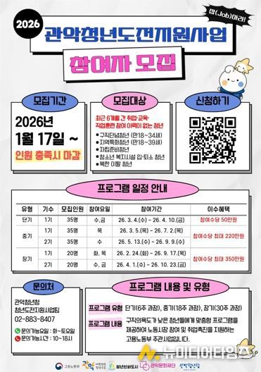 관악구가 구직을 단념한 청년들의 사회 진입을 돕기 위해 오는 1월 17일부터 ‘2026년 청년도전지원사업’ 참여자를 모집한다.