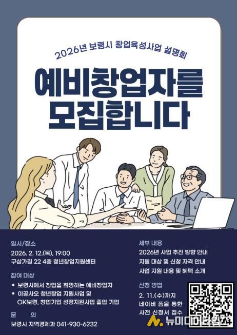 보령시는 오는 2월 12일 오후 7시 청년창업지원센터에서 예비창업자 및 창업기업을 대상으로 ‘2026년 창업육성사업 설명회’를 개최한다.