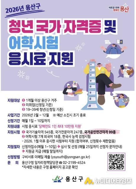 서울 용산구가 올해 ‘청년 국가자격증 및 어학시험 응시료 지원 사업’ 예산과 지원 종목을 대폭 확대해 시행한다. 기존 대비 지원대상을 100여 명 늘리고, 국가공인민간자격 99종을 새롭게 추가했다.