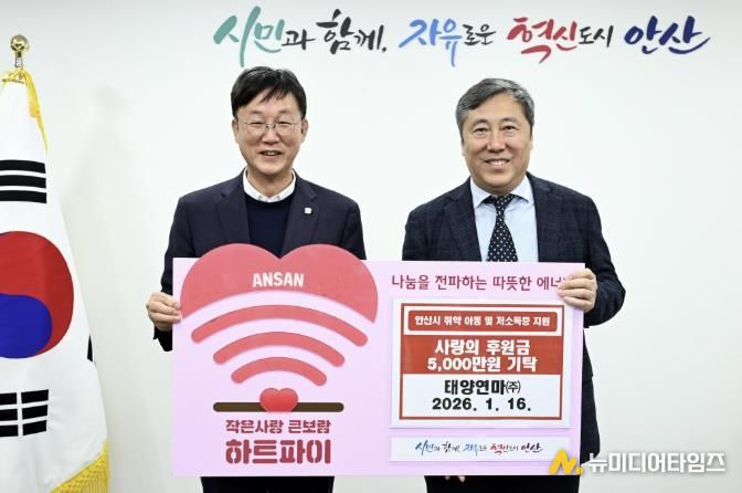 안산시는 지난 16일 태양연마㈜(사장 신석호)로부터 사랑의 후원금 5,000만 원을 기탁받았다고 19일 밝혔다.