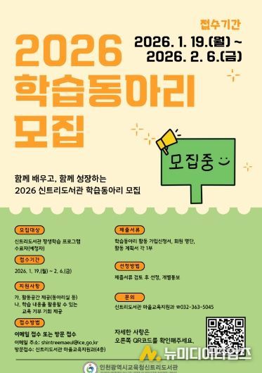 인천광역시교육청신트리도서관은 지역주민의 자발적인 학습 문화 조성과 지속 가능한 마을 학습공동체 형성을 위해 2026년 학습동아리를 모집한다.