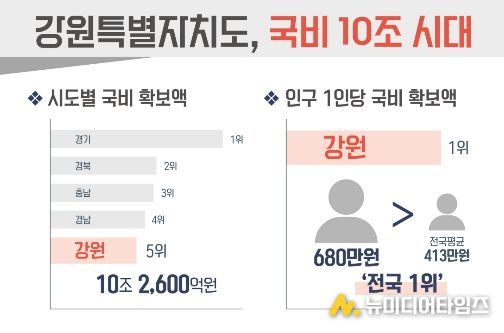 강원특별자치도는 국비 확보 10조 시대에 진입한 가운데, 인구 1인당 국비 확보액이 약 680만 원으로 전국 1위에 해당한다고 밝혔다.