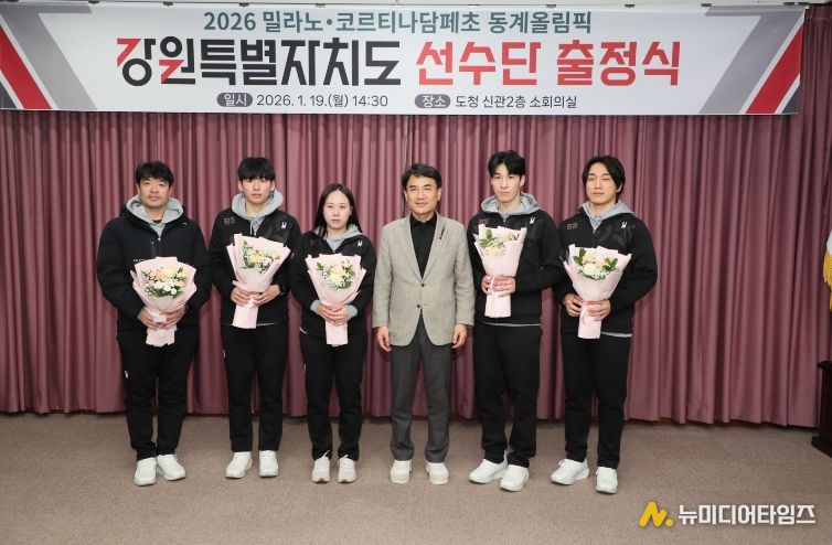 강원특별자치도(도지사 김진태)는 1월 19일(월) 오후 2시 30분, 도청 신관 소회의실에서 ‘2026 밀라노·코르티나담페초 동계올림픽’에 출전하는 도 선수단의 선전을 기원하는 출정식을 개최했다.