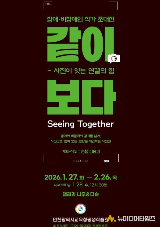 인천광역시교육청평생학습관은 인천 시민을 대상으로 2층 갤러리 나무와 다솜에서 ‘같이, 보다(Seeing Together) 장애인 작가 초대전’을 개최한다.