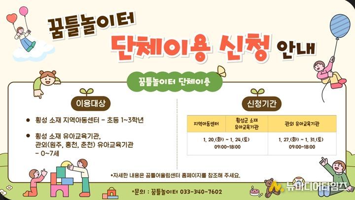 횡성군 꿈틀어울림센터 내 ‘꿈틀놀이터’가 아이들의 건강한 놀이 문화 확산을 위해 2026년도 상반기 단체 이용 신청을 받는다.