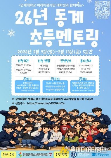 영월군청소년문화의집은 오는 2월 9일부터 13일까지 5일간 영월 관내 초등학생을 대상으로 ‘2026년 동계 초등멘토링 프로그램’을 운영한다고 밝혔다.