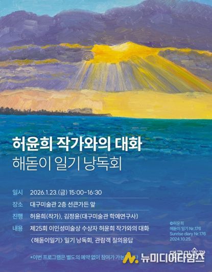 대구문화예술진흥원 대구미술관은 제25회 이인성미술상 수상자전 ‘허윤희: 가득찬 빔’의 전시 연계 프로그램으로 ‘허윤희 작가와의 대화: 해돋이 일기 낭독회’를 1월 23일 오후 3시, 대구미술관 2층 선큰가든에서 개최한다.