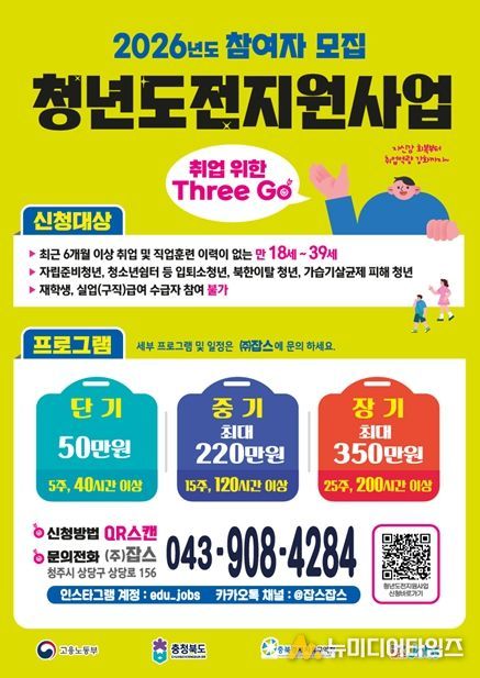 충북경제자유구역청은 구직 의욕이 낮아진 도내 청년들의 원활한 사회 진출을 돕기 위해 고용노동부가 주관하는 ‘2026년 청년도전 지원사업’의 국비 11억 6,000만 원을 확보하고 본격적인 참여자 모집에 나선다고 밝혔다.