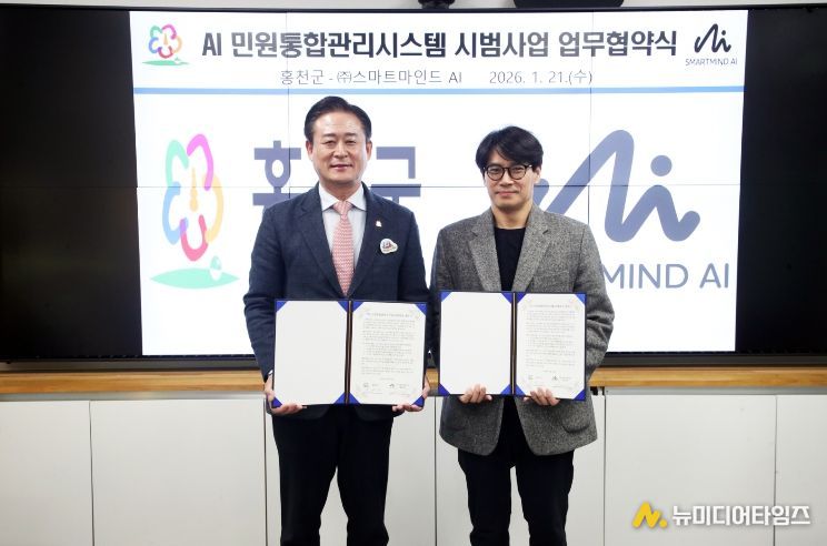 홍천군은 민원 처리의 신속성과 정확성을 높이기 위해 ㈜스마트마인드(대표 이상수)와 ‘AI 민원통합관리시스템’ 시범 사업 협약을 체결했다.