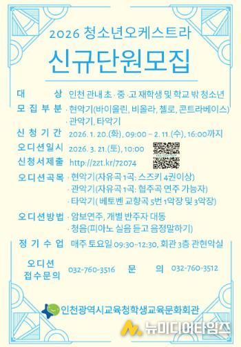 인천광역시교육청학생교육문화회관은 3월 21일 ‘2026학년도 청소년오케스트라 단원 모집 오디션’을 실시한다.