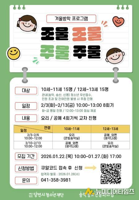 이번 프로그램은 2026년 2월 3일(화)부터 2월 13일(금)까지, 오전 10시부터 오후 1시까지 진행되며(12:00~13:00 점심시간 포함), 송악·송산·신평 지역에 거주하는 청소년 30명을 대상으로 한다.