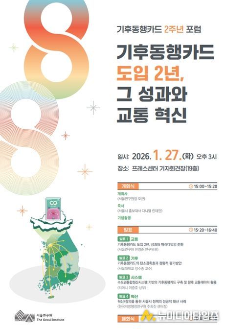 서울연구원은 27일 오후 3시, 한국프레스센터 기자회견장에서 '기후동행카드 도입 2년, 그 성과와 교통 혁신'을 주제로 기후동행카드 2주년 정책 포럼을 개최한다.