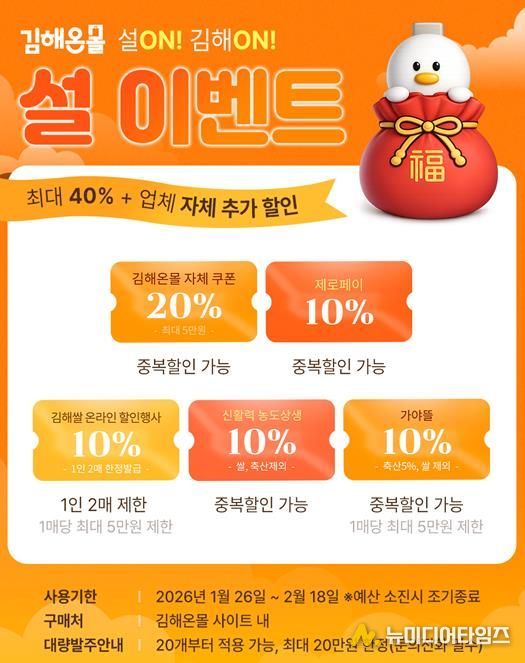 김해시 온라인 통합 쇼핑몰 ‘김해온몰’에서 진행하는 ‘설ON! 김해ON!’ 행사와 함께 진행되는 이번 행사에서는 김해시 공동 브랜드인 가야뜰 제품과 지역 우수 농특산물을 파격적인 가격에 만나볼 수 있다.