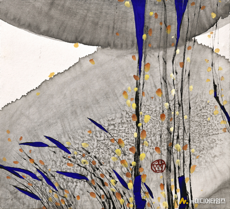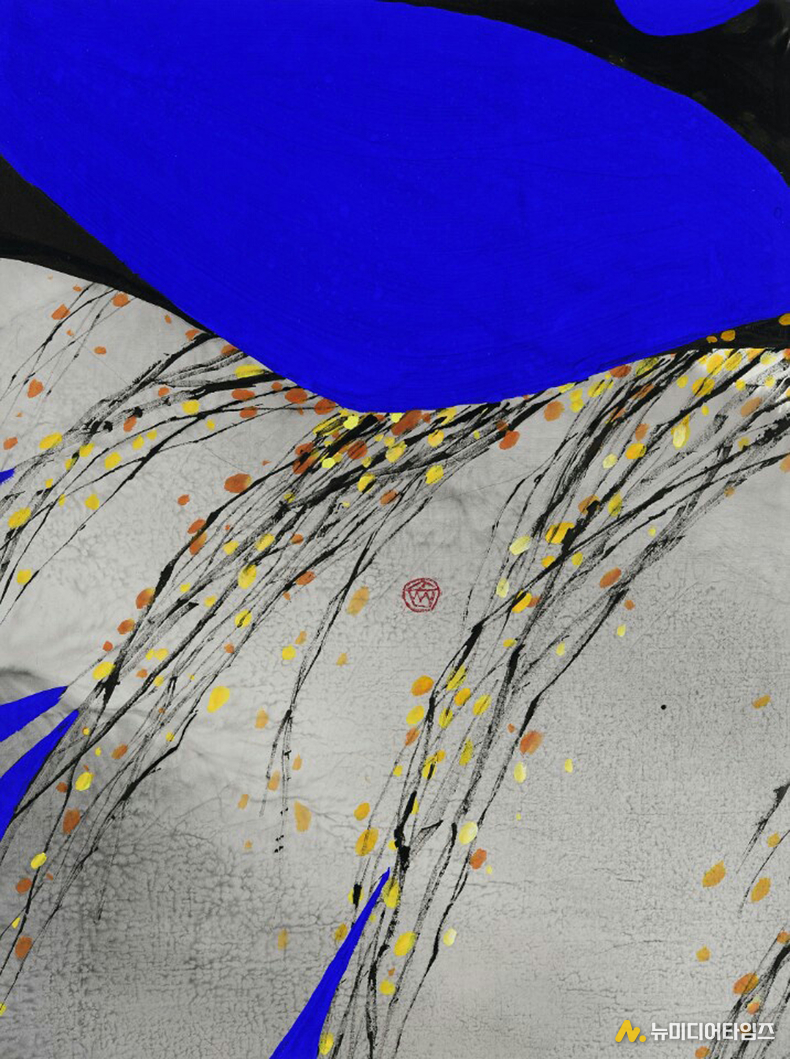겹겹이 스며든 먹빛은 단순한 색이 아니라 시간의 퇴적이며 감정의 침잠이다. 화면은 마치 광활한 대지이자 우주처럼 깊고 넓게 펼쳐진다. 그리고 그 정적을 가르듯, 코발트블루의 선이 힘 있게 등장한다. 단호하고도 생동하는 푸른 기운은 침묵의 공간을 깨우는 첫 숨결처럼 화면 위를 가로지른다.