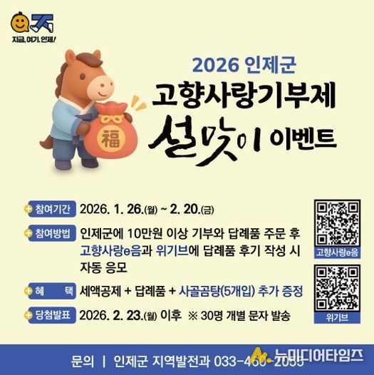 인제군은 2026년 설 명절을 맞아 고향사랑기부제 참여 확산을 위한 특별 이벤트를 오는 1월 26일부터 2월 20일까지 진행한다.