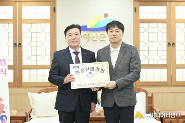 예산군은 지난 23일 여성친화적 근무환경 조성에 앞장서 온 대원헬스케어㈜에 ‘여성친화기업’ 인증 현판을 전달했다고 밝혔다.
