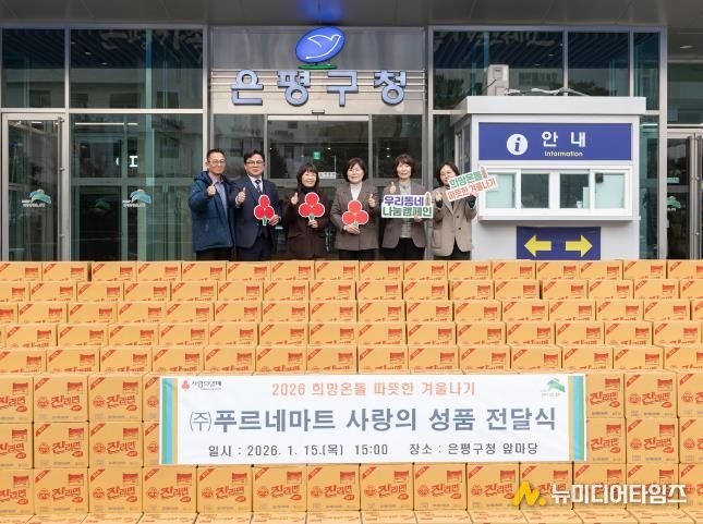 서울 은평구는 지난 15일 ㈜푸르네마트와 ‘2026 희망온돌 따뜻한 겨울나기’ 사랑의 이웃돕기 성품 전달식을 가졌다고 밝혔다.