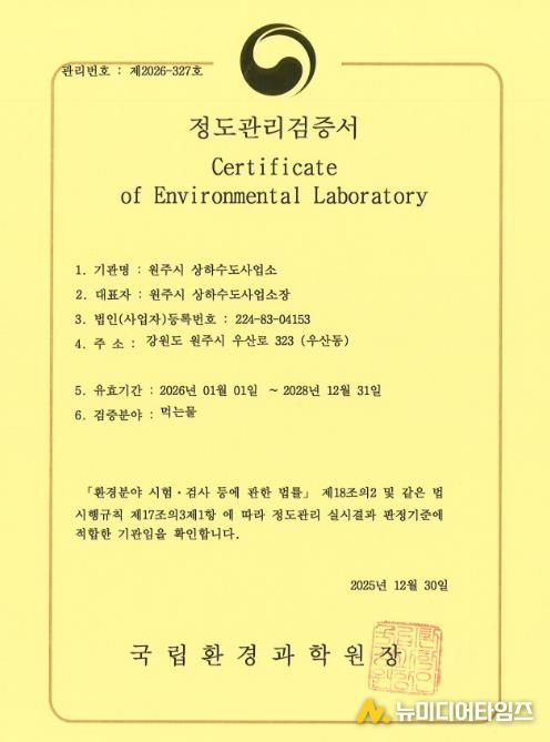 원주시 먹는물 검사기관이 국립환경과학원이 주관한 ‘2025년 먹는물 검사기관 정도관리 평가’에서 엄정한 심사를 거쳐 ‘적합’ 판정을 받았다. 이에 따라 2026년 1월 1일부터 2028년 12월 31일까지 유효한 ‘정도관리 검증서’를 공식 획득했다.