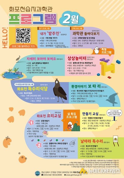 2월 프로그램은 유아·초등학생, 가족 단위 방문객을 대상으로 생태 체험, 기획, 모니터링 등으로 겨울철 화포천습지의 대표 생물인 독수리를 주제로 한 체험 프로그램이 중점적으로 운영된다.