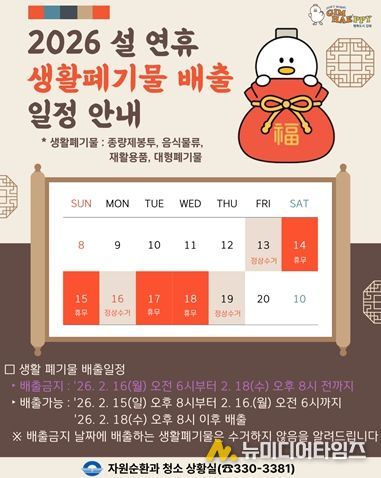 이번 설 연휴 5일동안 수거 대행업체의 휴무일은 2월 14일, 15일, 17일, 18일로, 2월 16일에만 정상 수거를 실시한다.