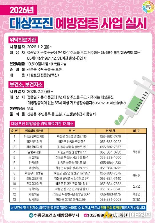 이와 관련한 자세한 사항은 하동군보건소 예방접종 부서로 문의하면 된다.