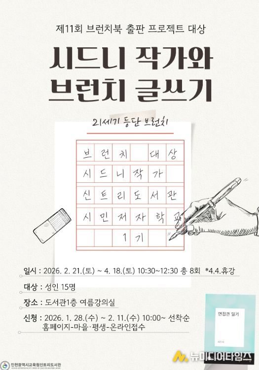 인천광역시교육청신트리도서관은 시민의 집필 능력을 키우고 예비 작가를 발굴하기 위해 ‘브런치 대상 시드니 작가와 함께하는 브런치 글쓰기’ 프로그램 참여자를 모집한다.