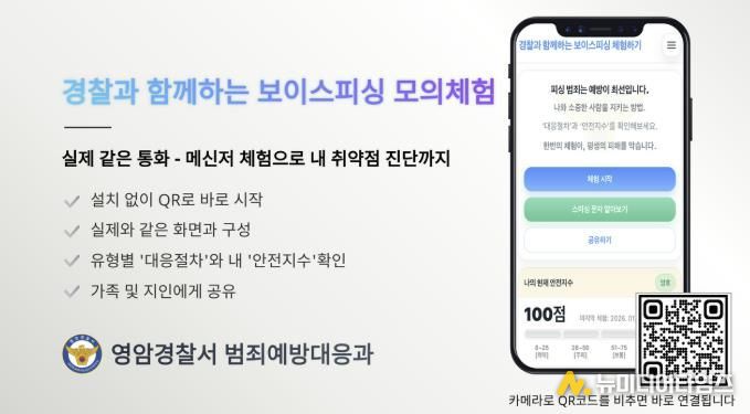 영암경찰서는 보이스피싱·메신저피싱 등 피싱 범죄를 실제처럼 체험하고, 체험 직후 개인별 위험도를 진단해 반복 학습까지 가능한 ‘보이스피싱 예방 모의 체험’ 웹-어플을 개발해 홍보에 나섰다.