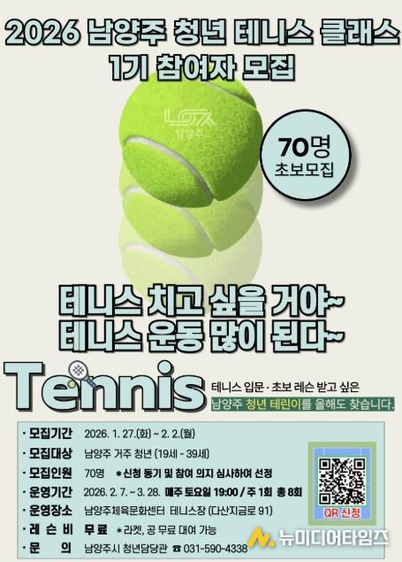 남양주시는 27일부터 내달 2일까지 ‘2026 남양주 청년 테니스 클래스 1기’ 참여자를 모집한다고 밝혔다.