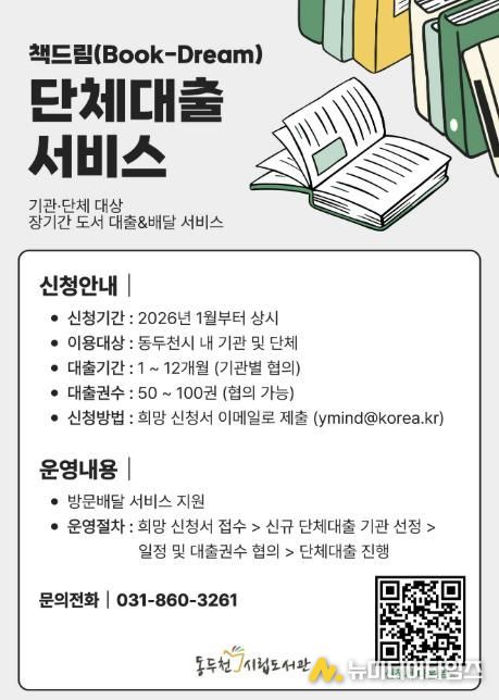 동두천시 도서문화사업소 시립도서관은 지역 독서문화 확산을 위해 관내 기관 및 단체를 대상으로 장기 도서 대출 서비스인 ‘책드림(Book-Dream)’을 2026년에도 연중 운영한다고 밝혔다.