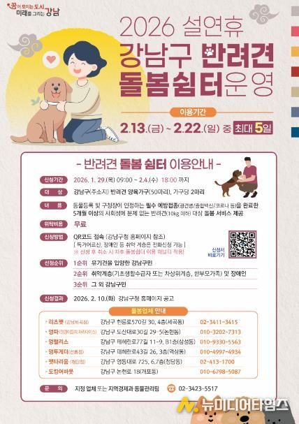 꿈이 모이는 도시, 미래를 그리는 강남구가 설 연휴 기간 안심하고 반려견을 맡길 수 있는 ‘반려견 돌봄 쉼터’를 운영한다. 접수는 1월 29일부터 2월 4일까지 진행하며, 선정된 반려견은 2월 13일부터 22일 사이 최대 5일간 무료로 돌봄 서비스를 이용할 수 있다.