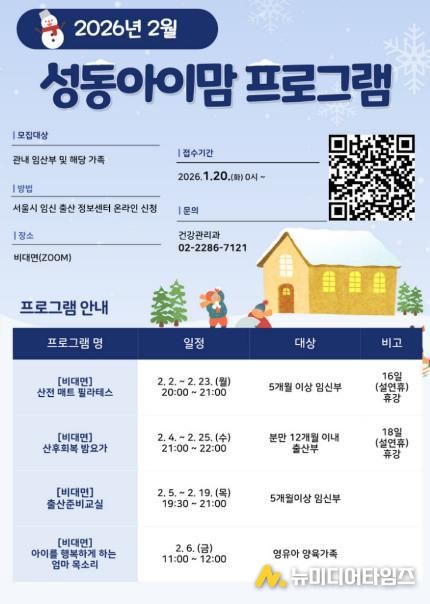 서울 성동구는 임산부들을 대상으로 '성동 아이맘 프로그램'을 운영한다고 밝혔다. 이번 프로그램은 4종류로 편성해 2월 2일부터 2월 25일까지 4주간 비대면(온라인)으로 진행된다.