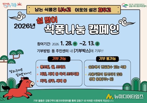 서울 강동구는 다가오는 설 명절을 맞이하여 복지 사각지대 주민을 지원하고 나눔 문화를 확산하기 위해 오는 1월 28일부터 2월 13일까지 ‘2026년 설 맞이 식품 나눔 캠페인’을 추진한다고 밝혔다.