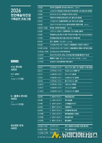 2026년 시즌의 시작은 최근 열린 천안예술의전당 신년음악회에서 국립심포니오케스트라와 홍석원 지휘 아래 첼리스트 문태국이 웅장한 무대로 알렸으며, 이후 △3월, 화이트데이 콘서트 ‘차이콥스키 피아노 트리오’·리투아니아 체임버오케스트라 with 첼리스트 홍진호 △4월, 스프링콘서트 ‘고잉홈프로젝트 with 피아니스트 손열음’ △5월, 뮤지컬 ‘어쩌면 해피엔딩’ △6월, 바이올리니스트 대니 구 데뷔 10주년 리사이틀 ‘The Journey Begins’·천안예술의전당 페스티벌 오케스트라 with 지휘 홍석원이 이어진다.