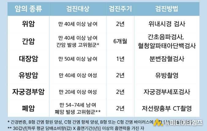 검진 대상 암종은 위암, 대장암, 간암, 유방암, 자궁경부암, 폐암 등 6종이며, 암종별로 연령, 성별, 검진 주기가 다르게 적용된다. 위암과 유방암은 만 40세 이상을 대상으로 2년마다 검진하고, 대장암은 만 50세 이상에게 매년 분변잠혈검사를 실시한다. 특히 간암과 폐암은 고위험군을 대상으로 하며, 정기적인 검진이 이뤄진다.