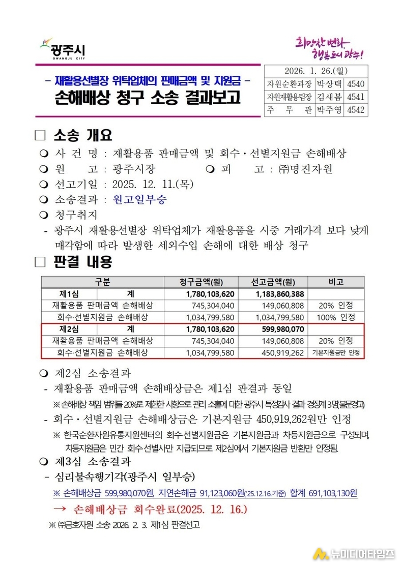 한편 광주시는 또 다른 재활용선별장 위탁업체에 대해서도 동일한 사안으로 추가 손해배상 소송을 진행 중이며, 오는 2월 3일 1심 판결 선고를 앞두고 있다. 판결 결과에 따라 광주시는 추가적인 손해배상금 환수 절차에 착수할 예정으로, 시민 세금 추가 회수 가능성도 열려 있다.