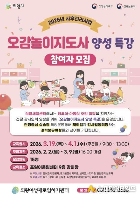 의왕시 여성새로일하기센터가 '오감놀이지도사 양성 특강'의 교육생을 모집한다.