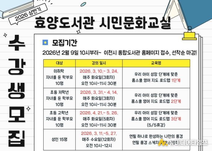 이천시 효양도서관은 오는 3월 10일부터 지역 주민의 독서 문화 진흥을 위해 상반기 시민문화교실을 운영한다.