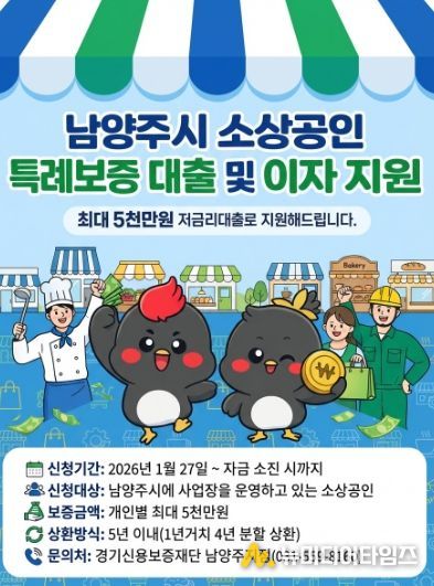 남양주시는 관내 소상공인의 자금난 해소와 경영 안정을 도모하기 위해 ‘2026년 소상공인 특례 보증 및 이차보전 지원사업’을 시행한다고 29일 밝혔다.