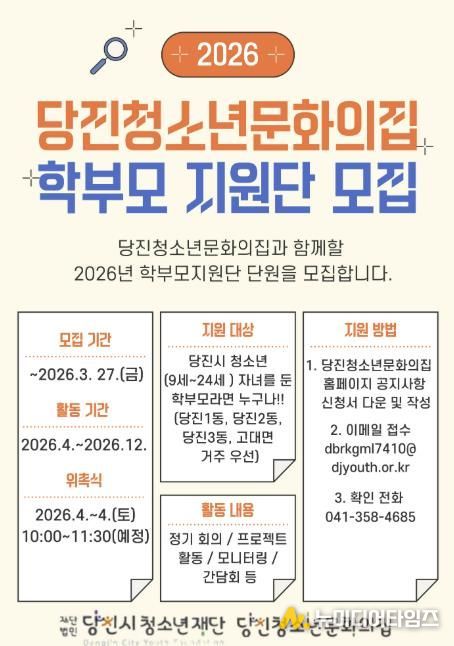 당진청소년문화의집 학부모지원단은 9세~24세 청소년의 보호자를 중심으로 3월 27일까지 모집 기간 및 4월 4일 위촉식 후 연간 ▲시설 운영 및 프로그램에 대한 의견 제안 ▲청소년 권리·안전 관련 의견 수렴 ▲행사 및 캠페인 참여 ▲청소년 성장 지원을 위한 모니터링 역할 등을 수행하게 된다.